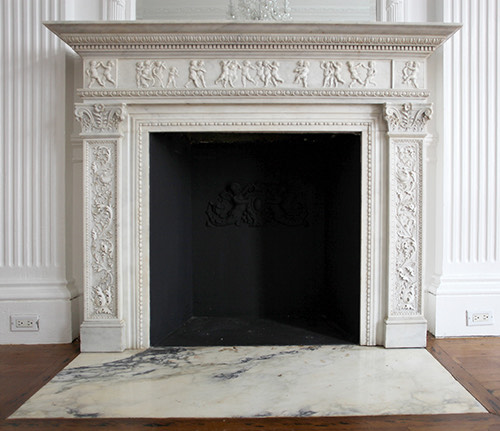 Plaster fireplace mantel featuring detailed carvings, including figures and floral motifs. The mantel has a smooth, painted finish with minimal wear. The design is symmetrical and elegant.